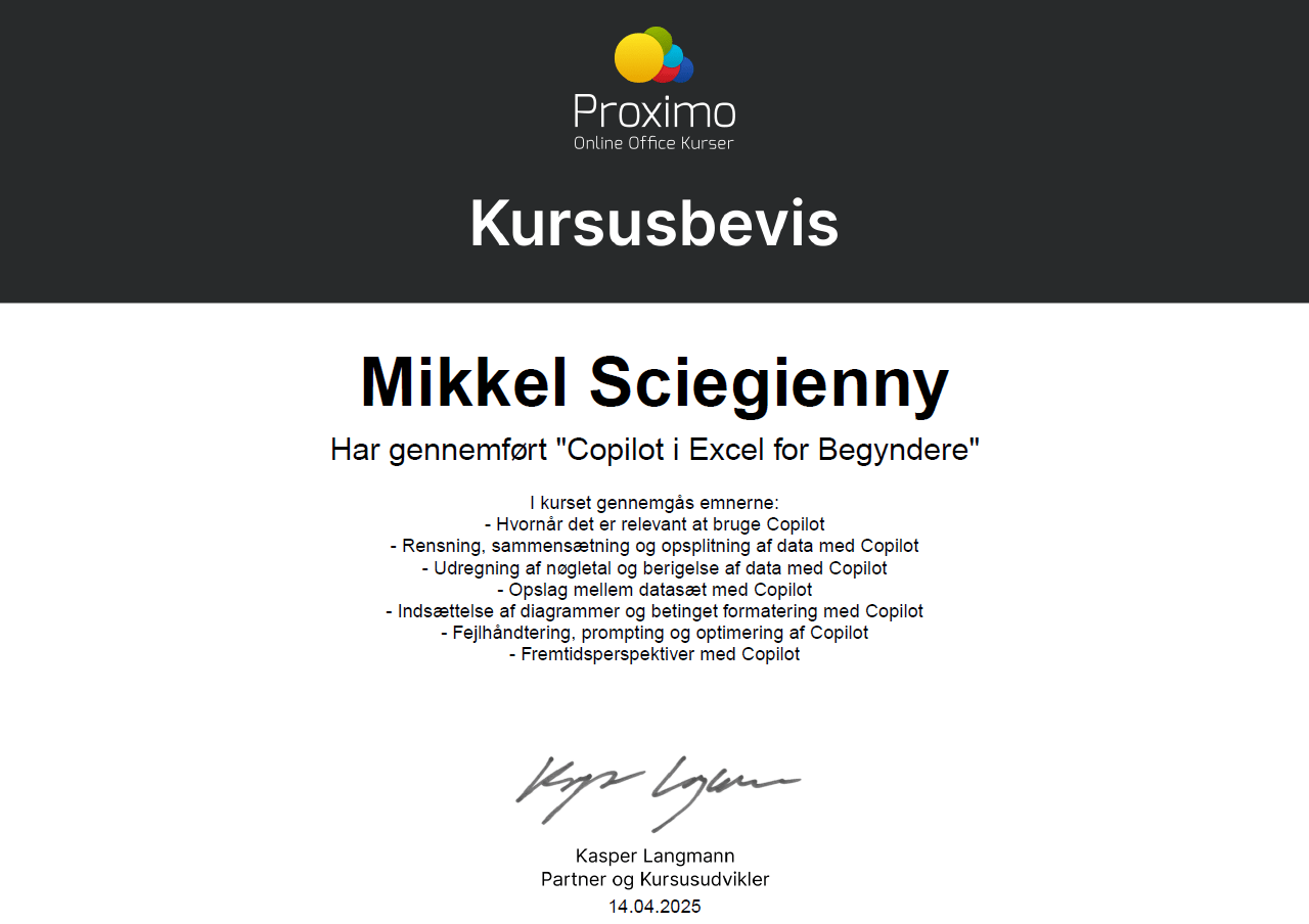 Når du har gennemført “Copilot i Excel for Begyndere”, er dit kursusbevis klar til download.