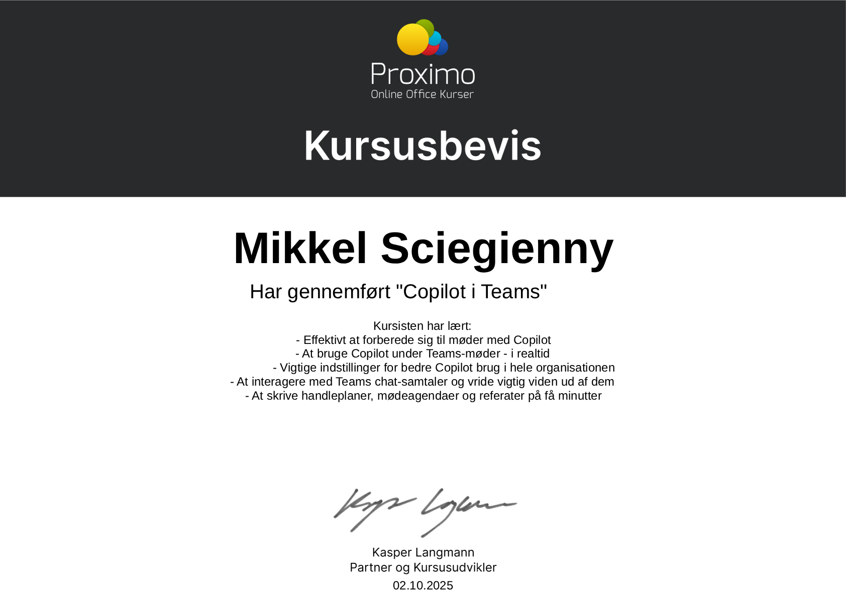 Når du gennemfører kurset, modtager du et officielt kursusbevis fra Proximo.