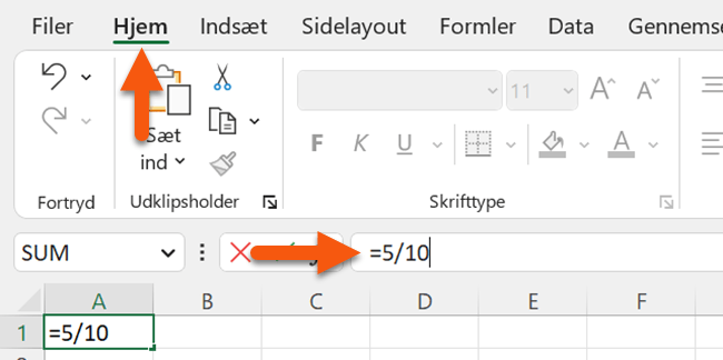 Husk altid at skrive “=”, før du indtaster formler.
