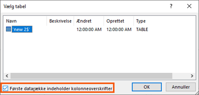 Vær opmærksom på at specificere om kolonneoverskrifter indgår i filen.