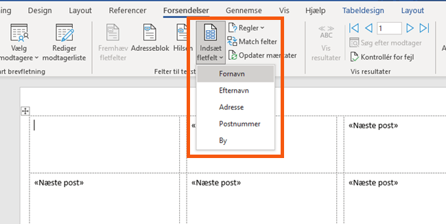 Derefter vælger du “Indsæt fletfelt” øverst, for hvert felt der skal indgå i skabelonen.