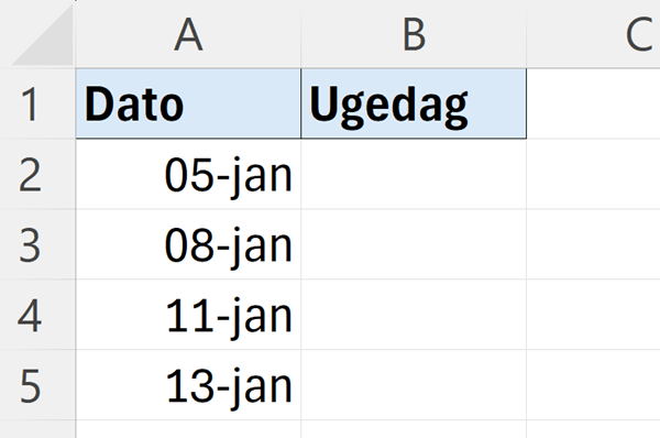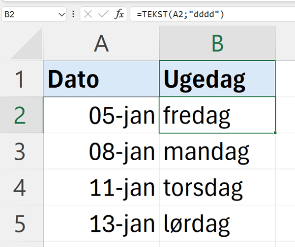 Bemærk, at TEKST-funktionen vil skrive ugedagens navn på det sprog din Excel-version er indstillet til. Hvis du vil ændre sproget i Excel, så læs her.
