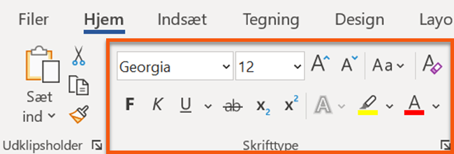 Du kan blandt andet ændre skrifttype, størrelse samt bruge Words almindelige funktioner som kursiv tekst, fed tekst eller understreget tekst for at tilpasse teksten i dine tekstbokse.