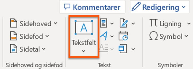 Klik på “Tekstfelt” helt ovre til højre i værktøjslinjen: