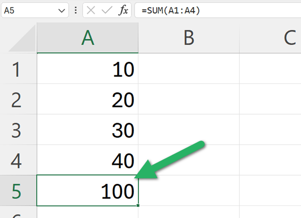 For eksempel, for at lægge nogle tal sammen, kan du bruge SUM-funktionen: