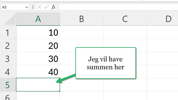 Trin 1: Klik på cellen, hvor du vil indsætte funktionen – altså cellen, hvor du vil have summen til at stå.