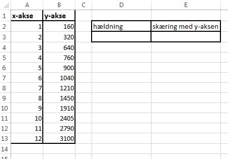 Placér markøren i celle D4 (der hvor du vil have a til at stå) og skriv: =LINREGR(her markerer du de data der er på y-aksen; her markerer du de data der er på x-aksen; …)