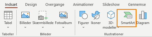Du finder SmartArt’ i gruppen ‘Illustrationer’, under fanen ‘Indsæt’.