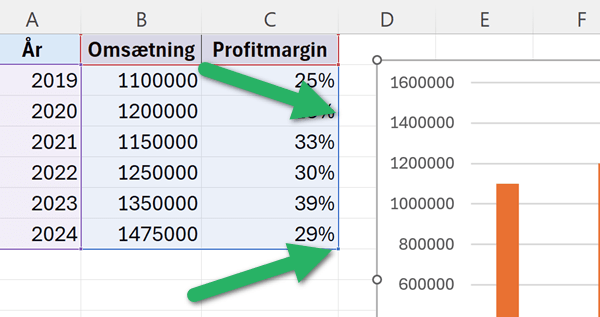 Trin 1: Udvid den data der er med i diagrammet, ved at markere diagrammet, og så trække de farvede områder ud til det nye data (profitmargin).