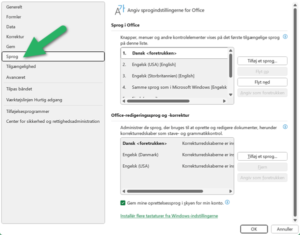 Trin 4: I det nederste områder vælger du “Office-redigeringssprog”.