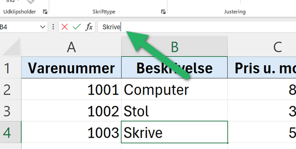 Du kan også bruge formelbaren til at redigere tekst, du allerede har indtastet i en celle.