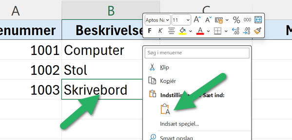 Du kan også højreklikke på cellen og vælge “Indsæt” fra menuen.